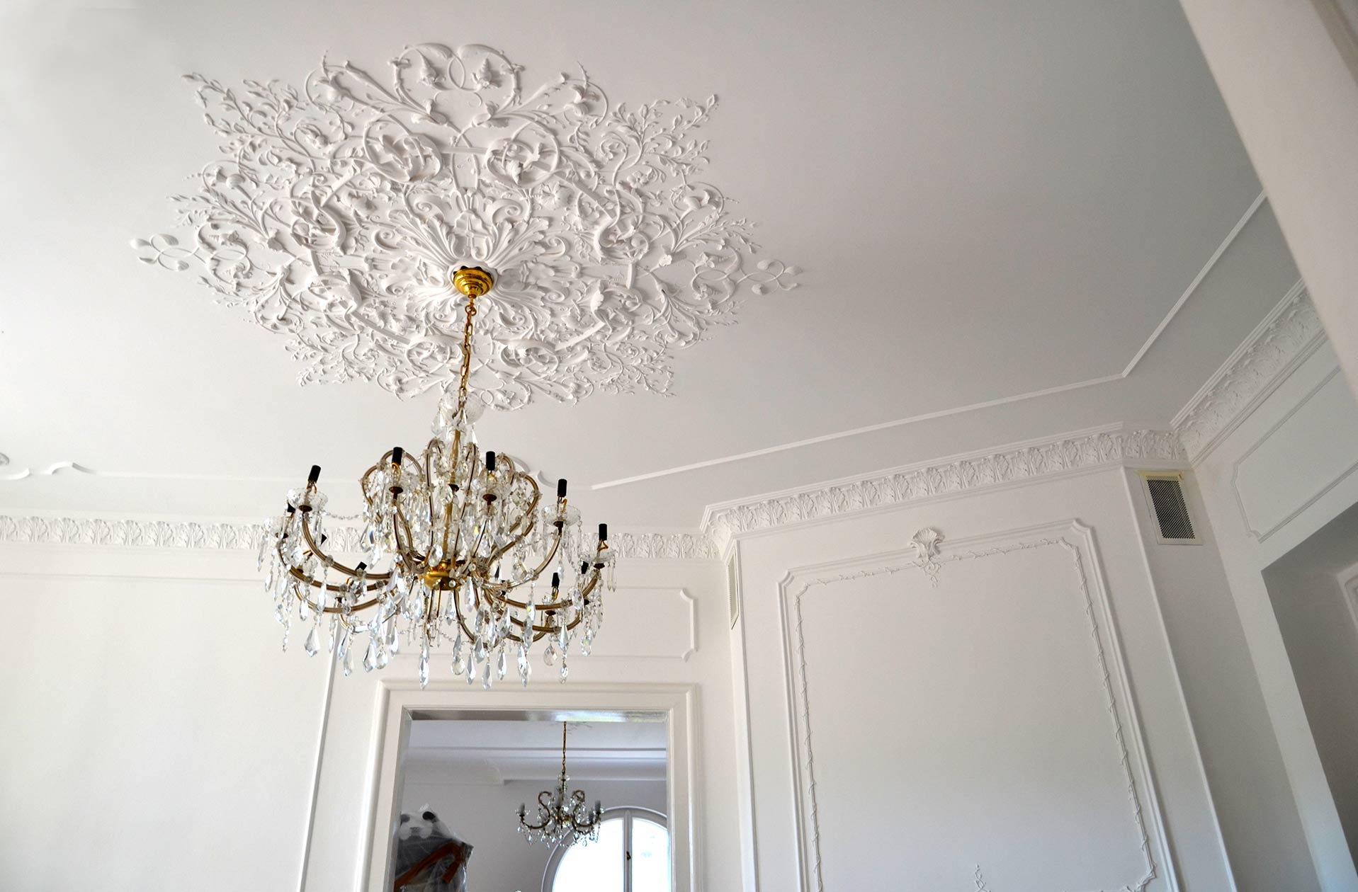 Nejsme jen umělecké štukatérství. Naše práce začíná už při samotném návrhu zdobného stropu, který dotáhneme do konce včetně výmalby.