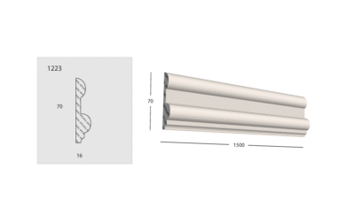 Dekorační lišta 1223 je vhodnou volbou pro dekor stěn nebo stropů. Dekorační lišta je v naší firmě vyráběna tažením plechové šablony z kvalitní štukaterské sádry. Dekorační lišty v katalogu standard řady 1000 vycházejí z našeho osobitého designu, který pro každou jednotlivě navrhujeme na základě zkušeností a průzkumu profilací historických dekoračních lišt. Každá z dekoračních lišt v naší dílně prochází přísnou kontrolou než-li je expedována k zákazníkovi.