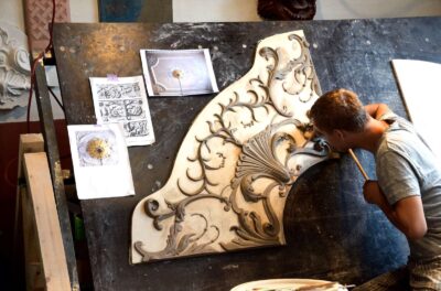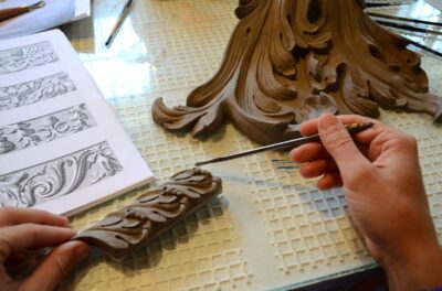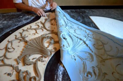 Tolik k informacím číselným a nyní více o pocitech. My jsme rozetu navrhli pro barokní repositorium, které navrhnul Santini-Aichel ( dílo je mu připisováno ). Rozeta ctí vrcholné baroko a je volnou kopií inspirovanou vícero existujících historických prvků. Než jsme přikročili k samotné sochařské práci, udělali jsme důkladný průzkum správného výběru daných inspirativních prvků.