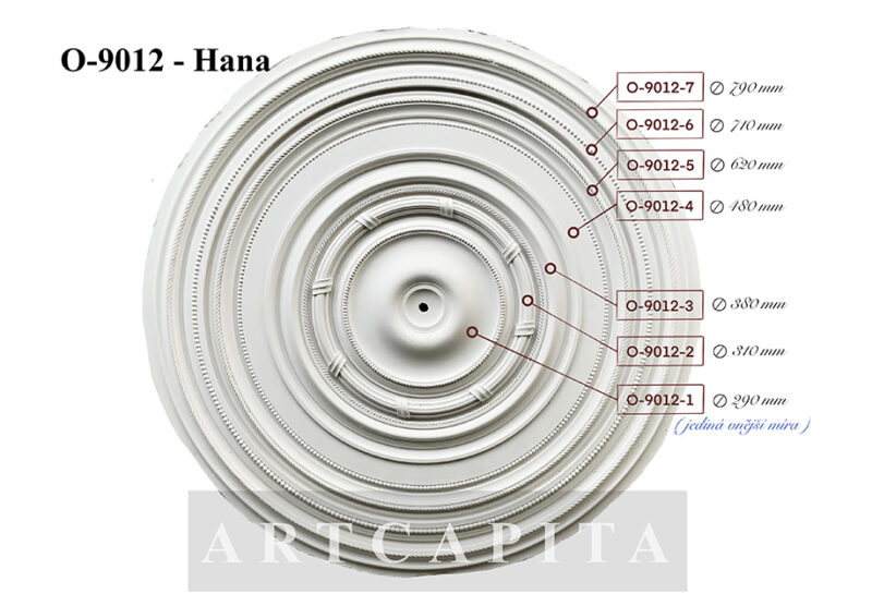 Stropní rozeta Hana O-9014 je souborem více okruží, která lze jednotlivě kombinovat s rozetovými jádry, jež naleznete v našem katalogu v kategorii stropních rozet. Jednotlivá okruží je možné dále doplnit medailony, kartušemi nebo samostatnými zdobnými listy, a vytvořit tak v interiéru velmi vkusné a zároveň decentní stropy v klasickém architektonickém stylu.